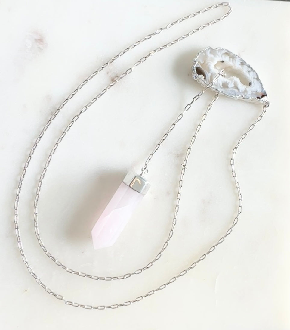 .925 Sterling Silver Lariat Necklace with Rose Quartz