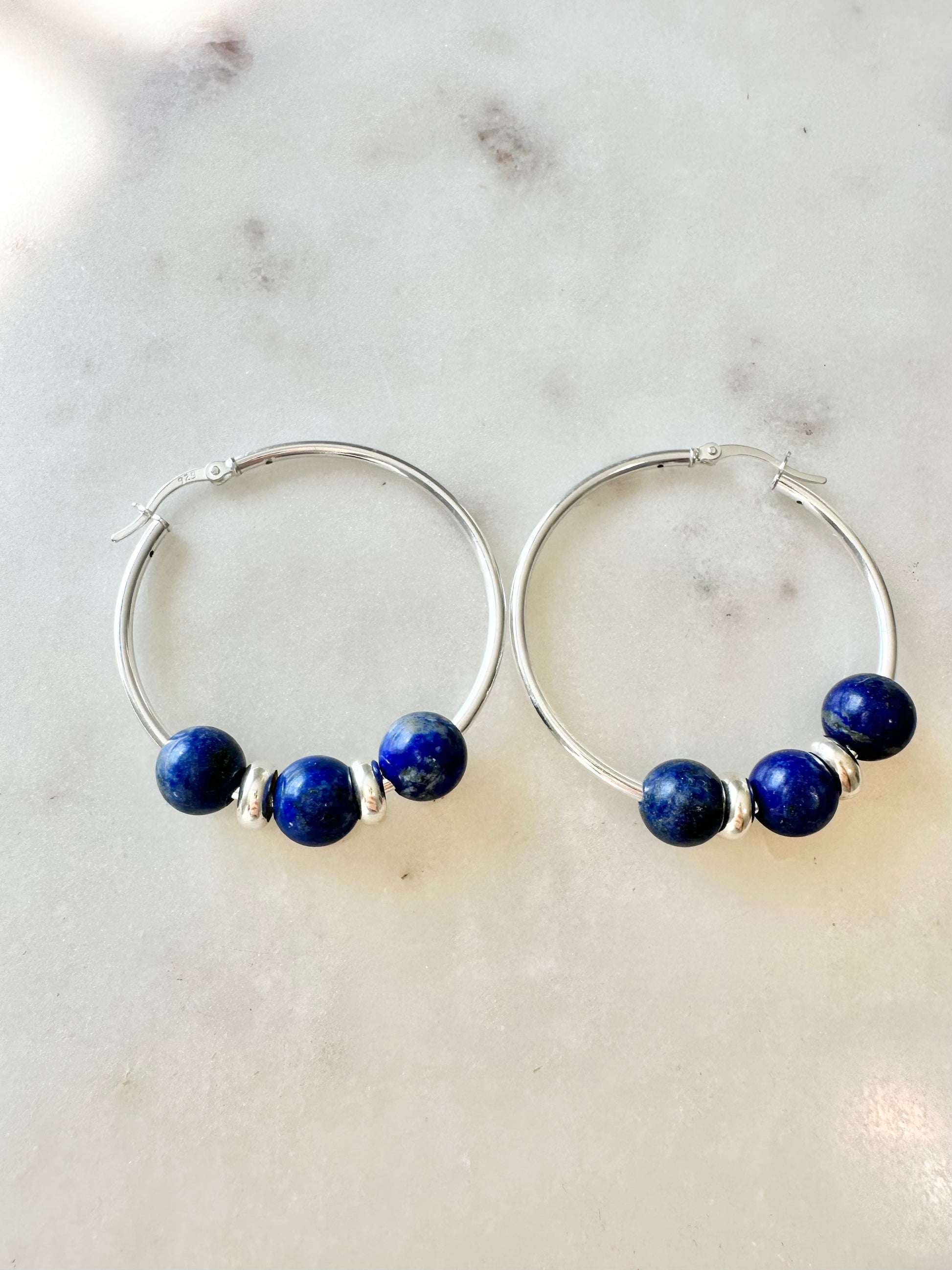 .925 Sterling Silver Hoop Earrings with Lapis Lazuli