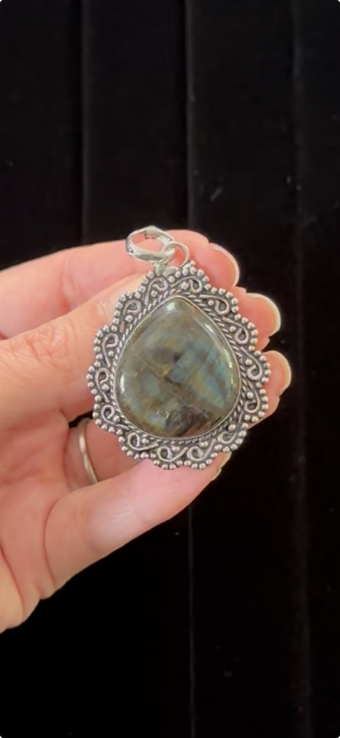 Handmade, All Natural Labradorite Stone, Silver over Copper pendant.
