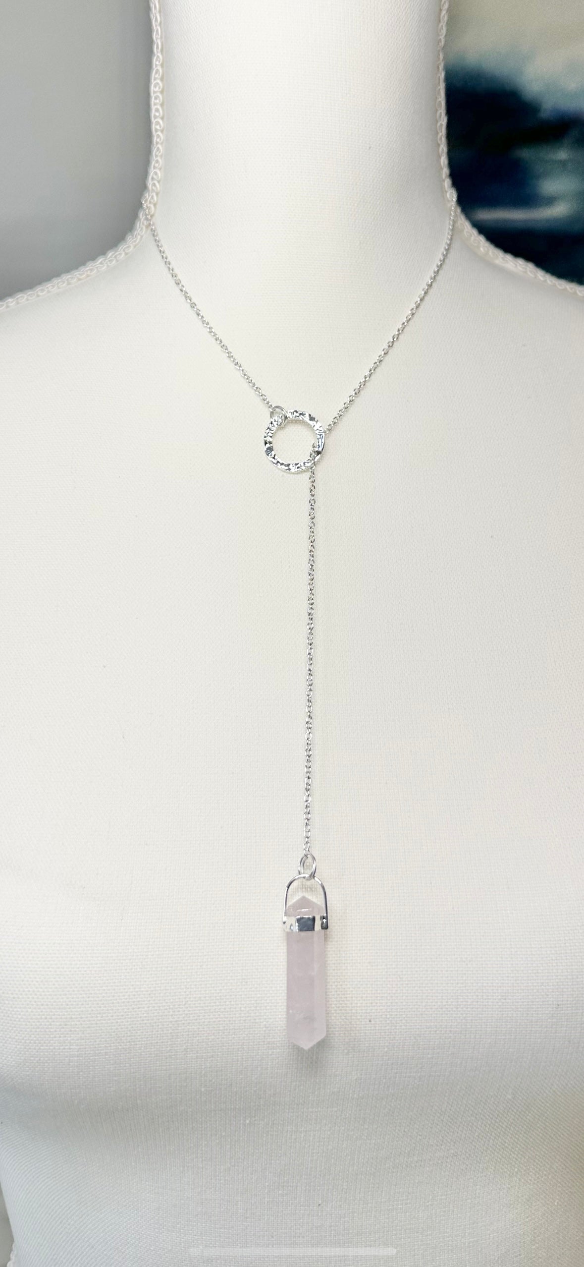 .925 Sterling Silver Lariat Necklace with Rose Quartz