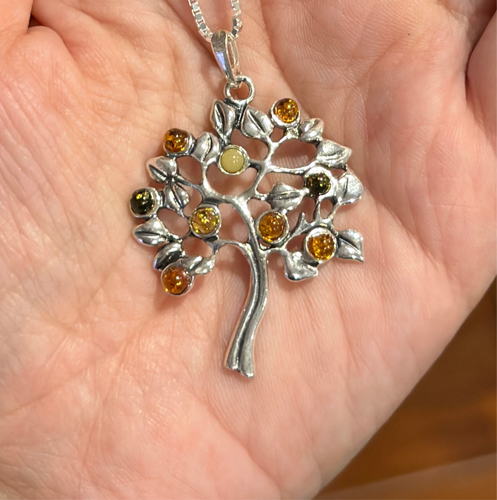 .925 Sterling Silver Baltic Amber Tree of Life Pendant