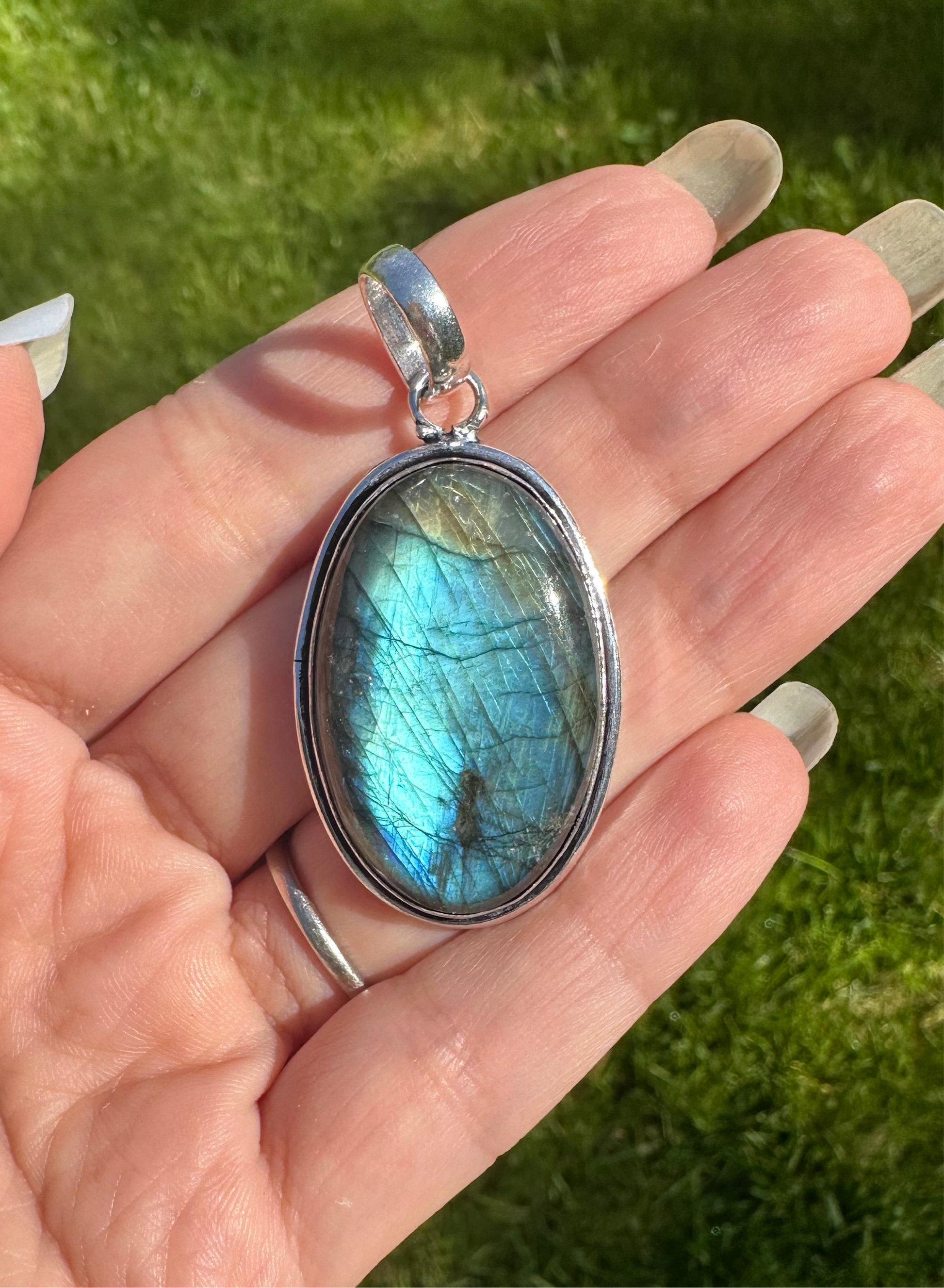 Handmade, All Natural Labradorite Stone, Sterling over Copper, 2 inches long including bail, 1 inch wide pendant