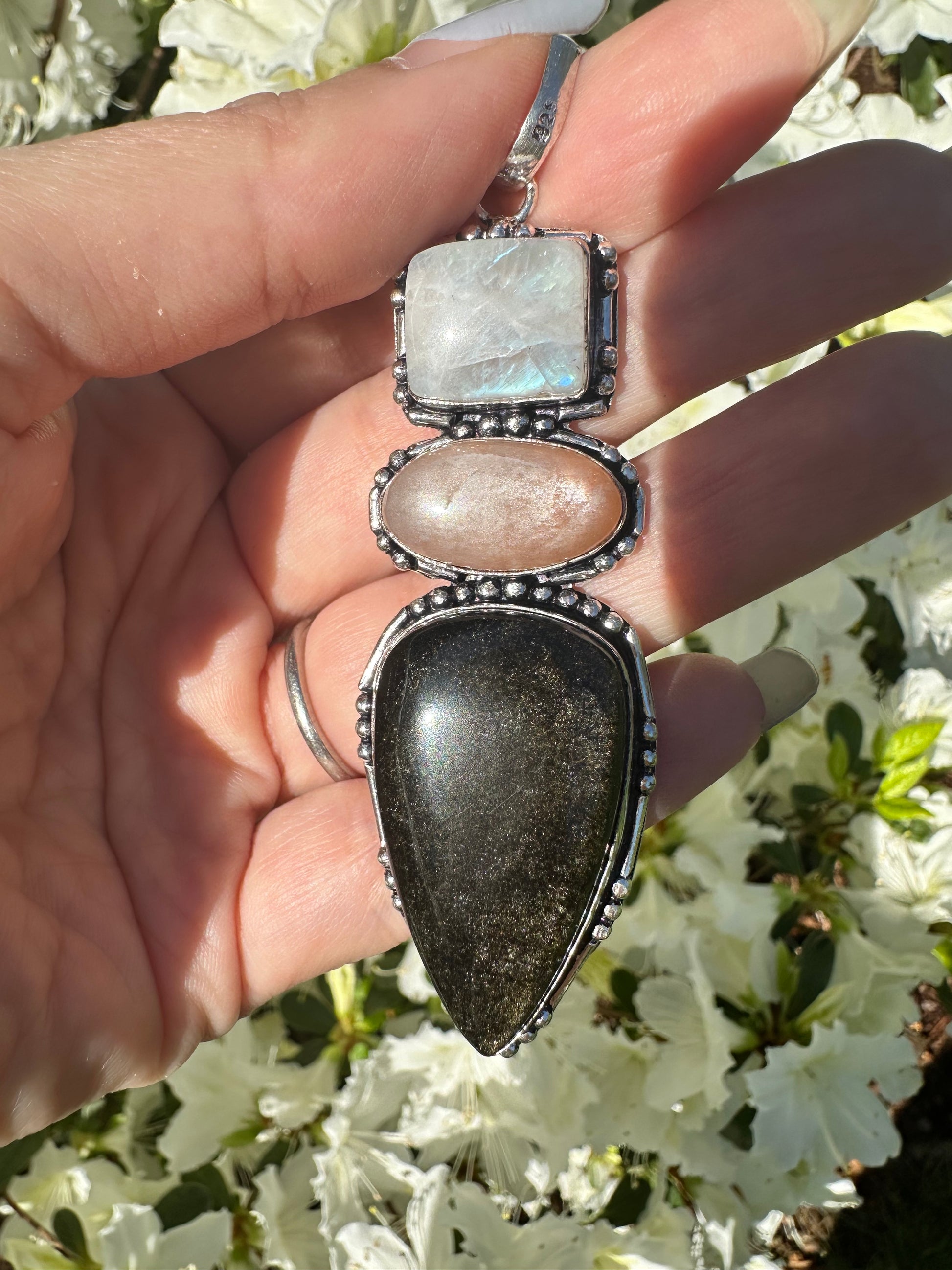 Silver Moonstone, SunStone and Golden Sheen Obsidian Pendant