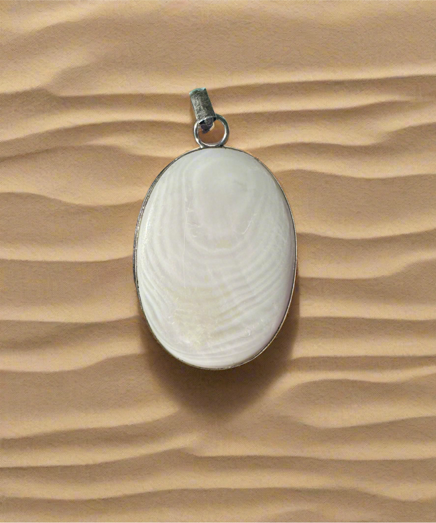 Handmade, All Natural Stone -Mother of Pearl, Sterling over Copper, 2 inches long including bail, 1 inch wide pendant